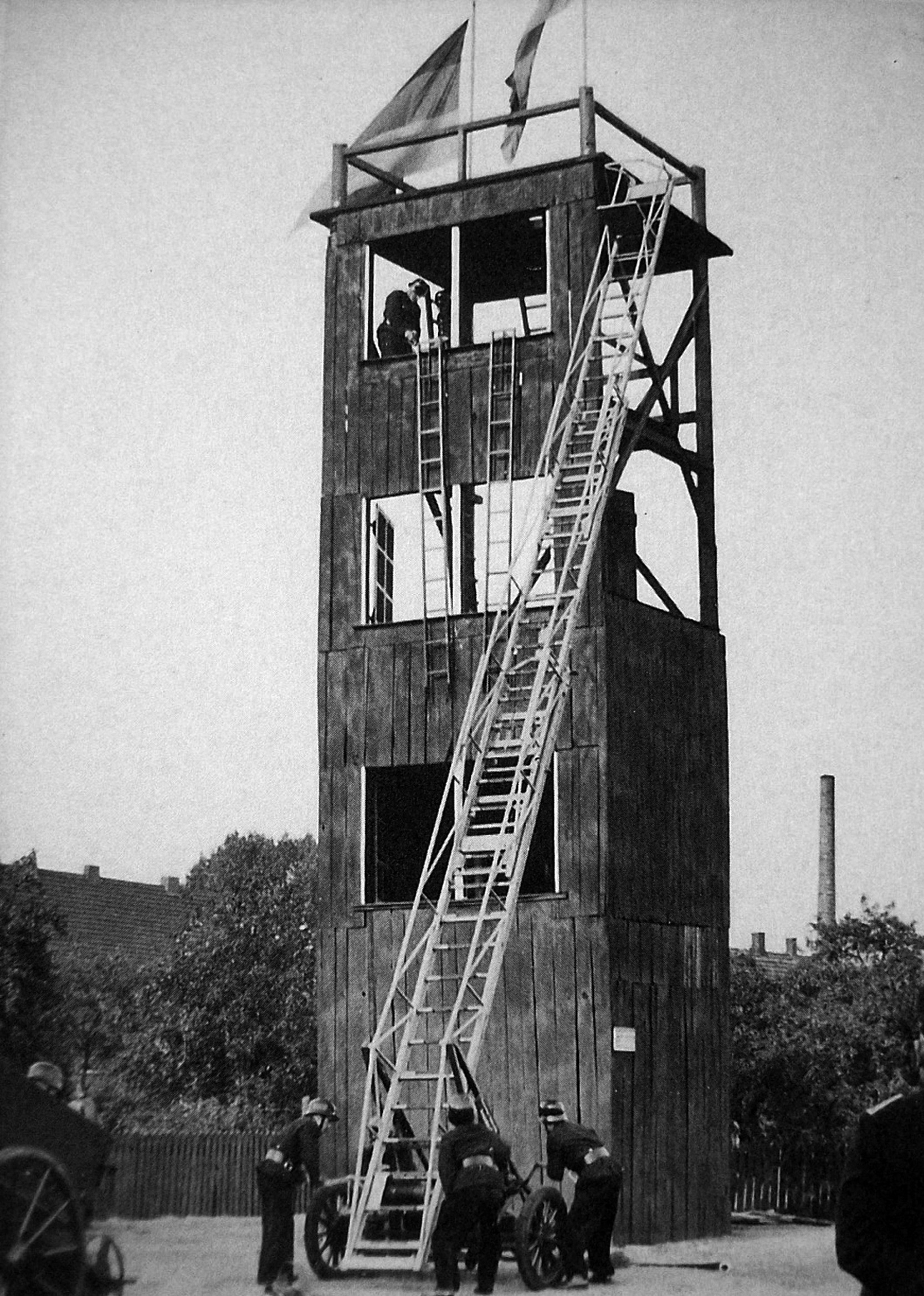 1929 wurde die neue Feuerwache an der Salzberger Straße in Dienst gestellt. Mit dabei der neue Sirenen-Turm. Mit der Sirene wurden nun die Feuerwehrleute zum Einsatz gerufen. Und Mittwochs, pünktlich um 12.00 mittags gab es den Probealarm. Aber auch die Feuerglocke blieb noch für einige Jahre aktiv. Das Foto zeigt die Feuerwache im Jahr 1986